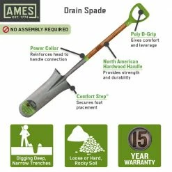 The Ames D-Handled Drain Spade is designed for multiple uses with its long and narrow blade. It’s the best tool for uprooting and transplanting live trees and shrubs. It can also be used for digging deep holes, cleaning out ditches or trenches and working in tight spaces.