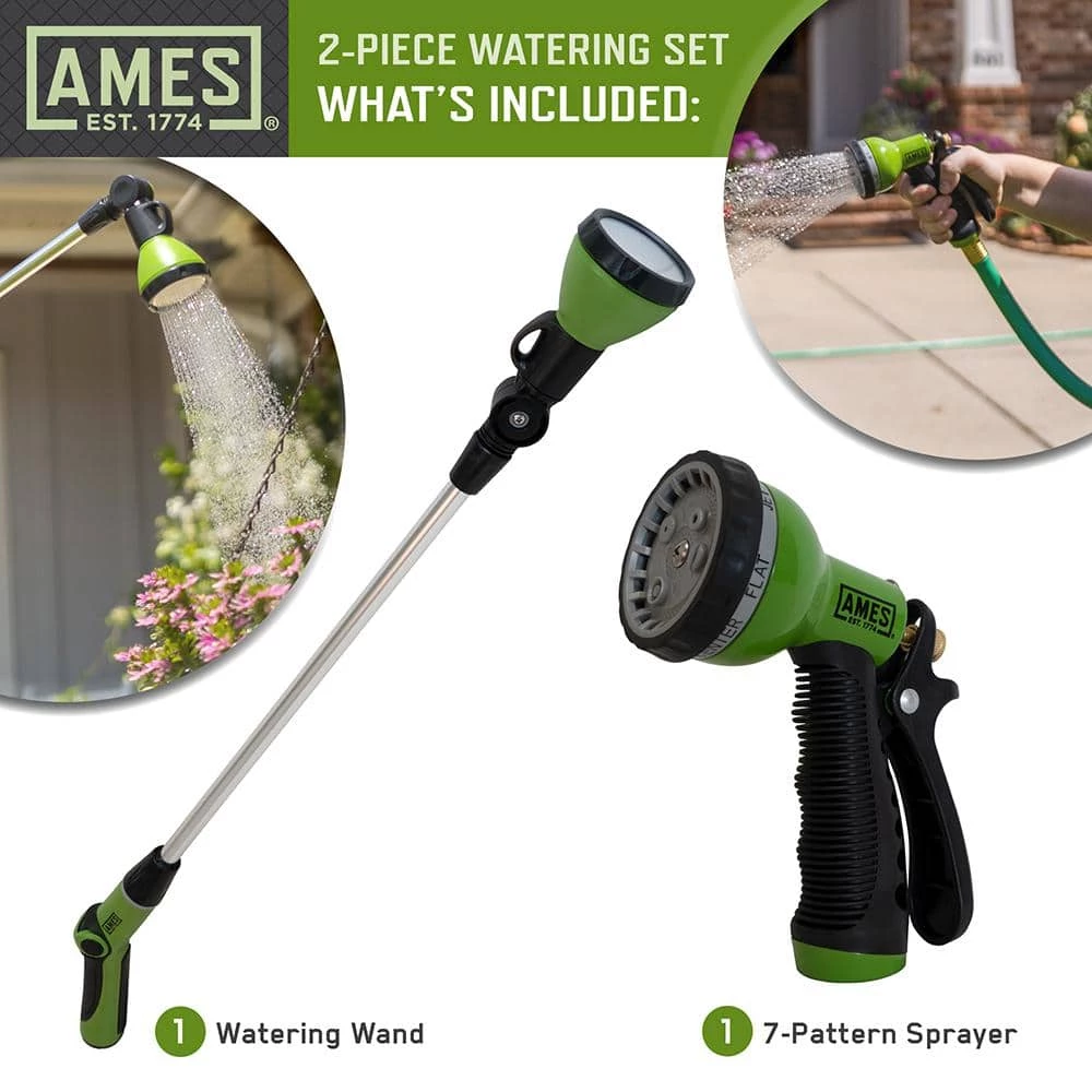 With the Ames (2) Piece Sprayer Set, your irrigation needs are covered for your lawn or garden area. This watering tool set is ideal for conveniently watering gardens, flowers, hanging planters, raised beds, vegetable plants, trees, fruit trees, shrubs, grass and more. The 7-Pattern Sprayer features seven adjustable nozzle spray patterns from shower, flat, center, cone, sprayer, soaker to spray mist. With so many setting options this versatile watering tool can water delicate plants and flowers, or more durable plantings like trees. During use, the easy to rear trigger features a lock option for continuous spray that is easy to activate. The included long-reach watering wand features a shower spray pattern for ideal watering coverage. Easily adjust the water flow of the shower sprayer with the easy to control twist sprayer cap. With less water flow, you can water more delicate plants like flowers or herbs. During use, the easy to control thumb control controls water flow and has a lock feature. The non-slip, soft grips will allow you to complete your outdoor chores with comfort. This hose attachment set is rated for up to 90 PSI. Easily connect to your standard 5/8″ garden hose to quickly start watering your garden area right out of the box with no assembly or installation required. Use this sprayer set to water your lawn, grass, gardens, vegetables, herbs, fruit, shrubs and hard to reach areas. These hose attachments can be used in all seasons for your watering needs.