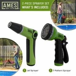 With the Ames 2-Piece Sprayer Set, your irrigation needs are covered for your lawn or garden area. This watering tool set is ideal for conveniently watering gardens, flowers, vegetable plants, trees, fruit trees, shrubs, grass and more. The Jet Sprayer features 3 adjustable nozzle settings from mist, to cone to jet spray. Use the mist setting for delicate plants or flowers. The cone setting can be used to water a wide area for gardens, shrubs or lawns. The jet spray setting can also water more durable garden areas. During use, the easy to control thumb control and non-slip, soft grip will allow you to complete your outdoor chores with comfort. The 7-Pattern Sprayer features 7 adjustable nozzle spray patterns from shower, flat, center, cone, sprayer, soaker to spray mist. With so many setting options this versatile watering tool can water delicate plants and flowers or more durable plantings like trees. During use, the easy to rear trigger features a lock option for continuous spray that is easy to activate. The non-slip, soft grips will allow you to complete your outdoor chores with comfort. This hose attachment set is rated for up to 90 PSI. Easily connect to your standard 5/8 in. garden hose to quickly start watering your garden area right out of the box with no assembly or installation required. Use this sprayer set to water your lawn, grass, gardens, vegetables, herbs, fruit, shrubs and more. These hose attachments can be used in all seasons for your watering needs.
