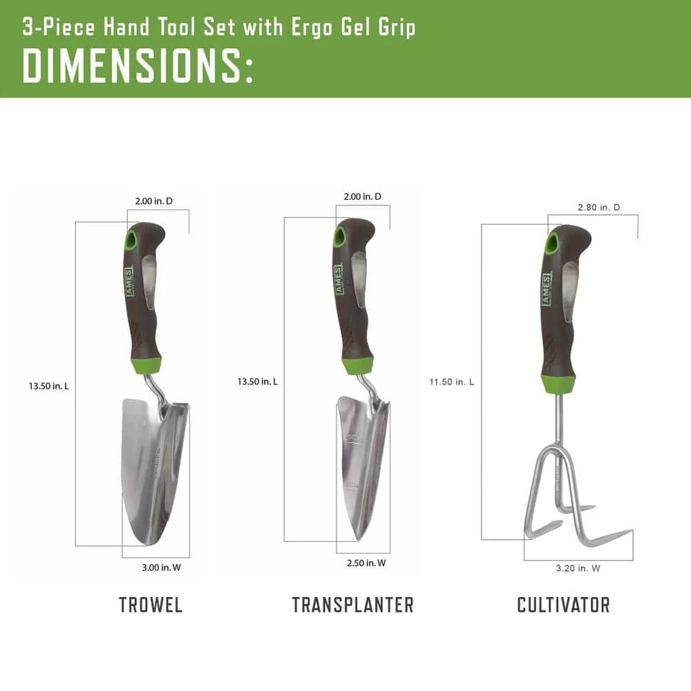 This 3-piece set consists of a hand trowel, a hand transplanter and a hand cultivator that are a handy trio for all digging, transplanting gardening-related projects. All tools feature an ergonomic handle design with a soft gel grip that cushions the hand and provides maximum comfort. Each tool features a durable stainless-steel head and is ideal for larger containers and garden beds, alike. This set also makes a great gift.