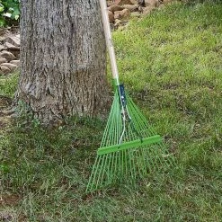 - Lawn rake features sturdy wood handle with non-slip, cushioned end grip
