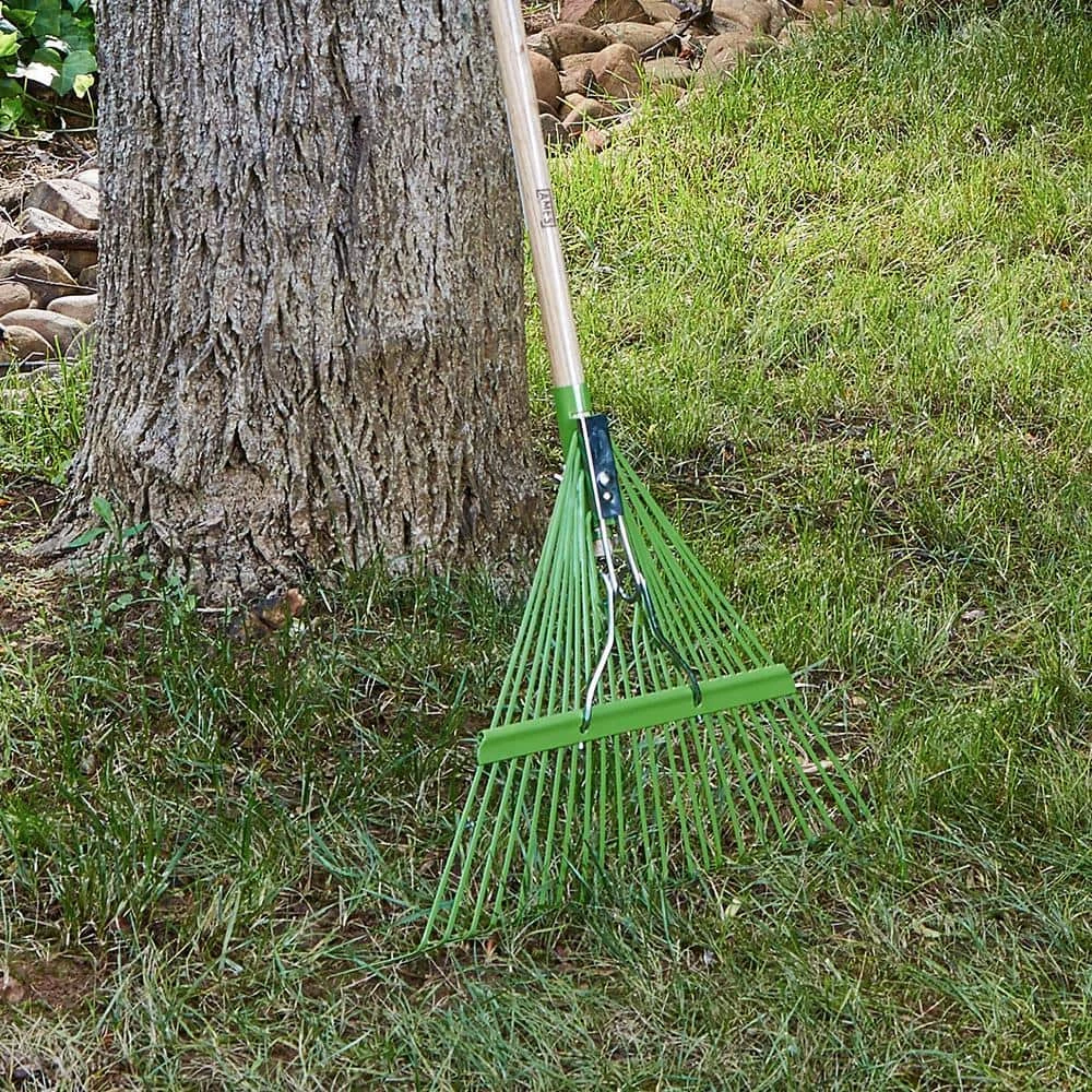 - Lawn rake features flexible steel tines for raking and for removing debris and thatch from lawns
