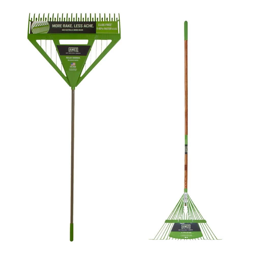 Speed up your yard work projects with this raking set. Designed for durability, this set includes a dual tine leaf rake and a 22 tine lawn rake. The dual tine rake features a dual tine design, collecting more leaves in a single pass and offering a clog-free design to prevent leaves from sticking to the rake. This sturdy rake also features a cushioned grip and rubber-coated handle, making it comfortable for projects all season long. The 22 tine wood handle lawn rake has spring backed tines, sturdy wood handle, cushioned grip, and a bolted rake head for additional durability.