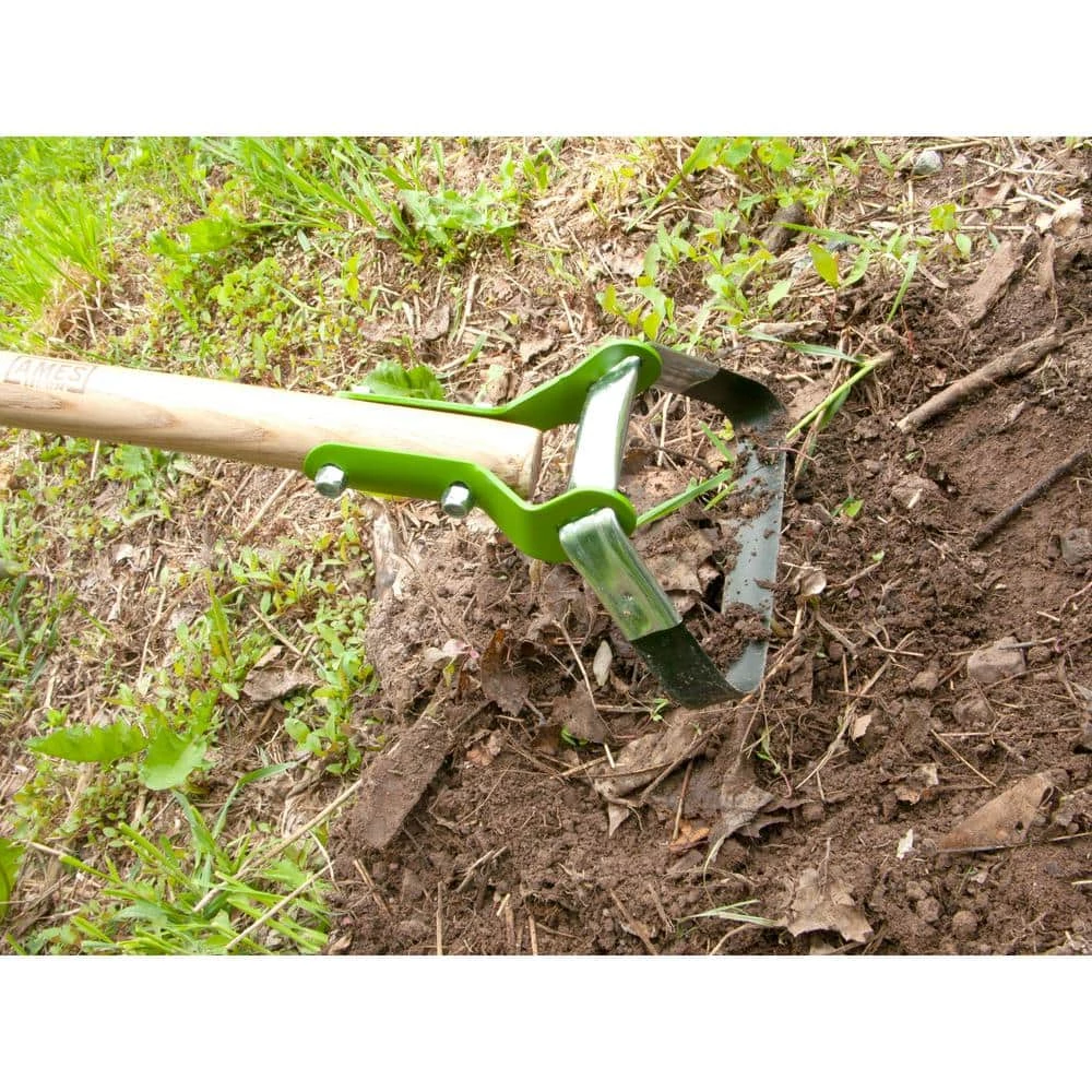 - 2-prong weeding hoe features multi-purpose head for chopping and cultivating and a durable steel head to handle connection