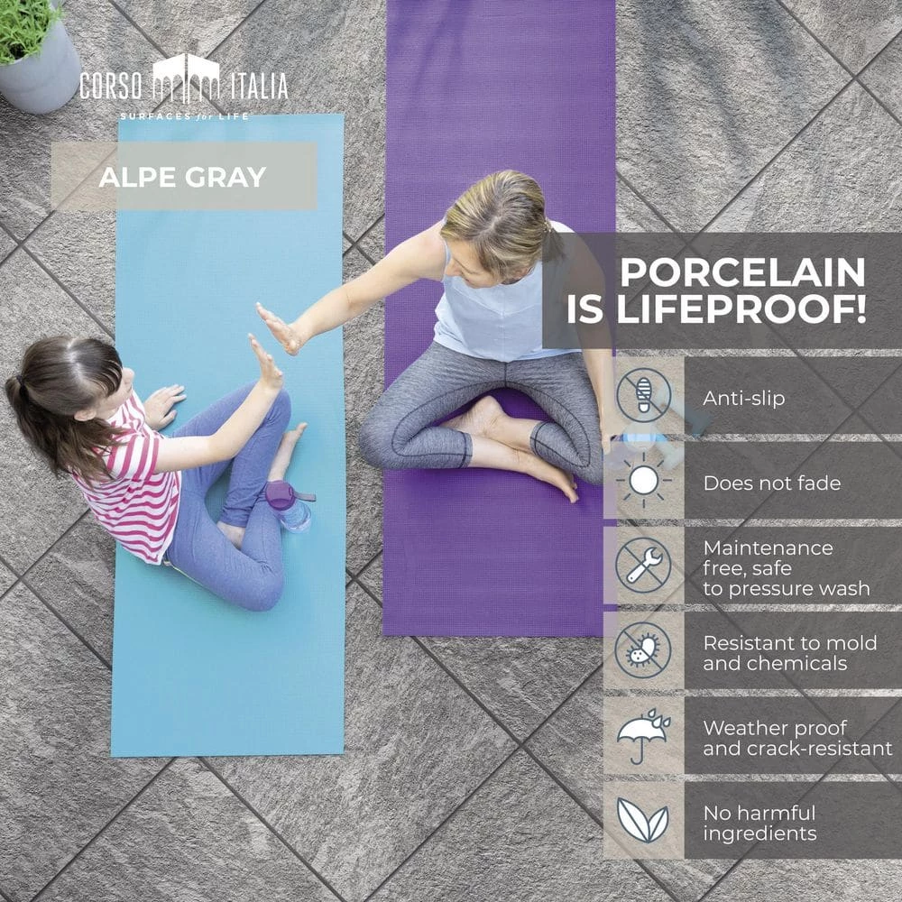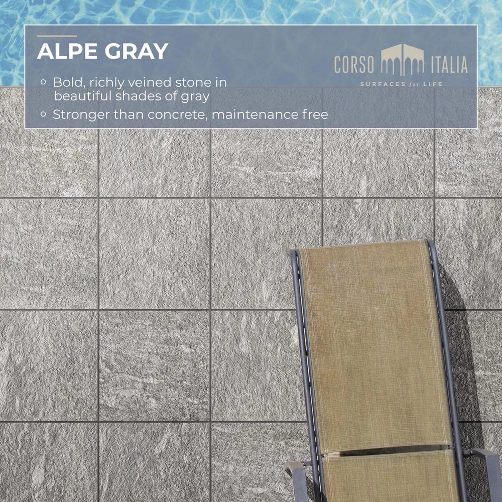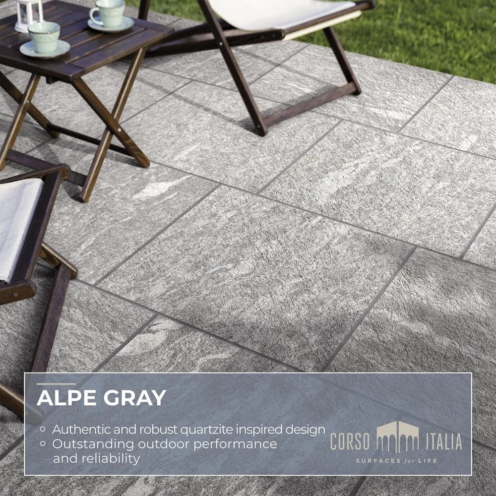 Alpe Gray reproduces the details of quartzite stones, rich in veining and chromatic changes, in a resistant, functional and safe solution for outdoor use. Featuring a high mechanical resistance, this 24 in. x 48 in. x 0.75 in. paver is twice as thick as conventional porcelain. Alpe Gray is fit for public and private outdoor venues, and is suitable for dry installation on grass, sand and gravel.