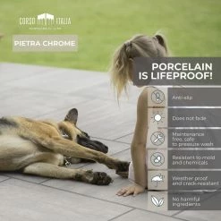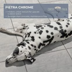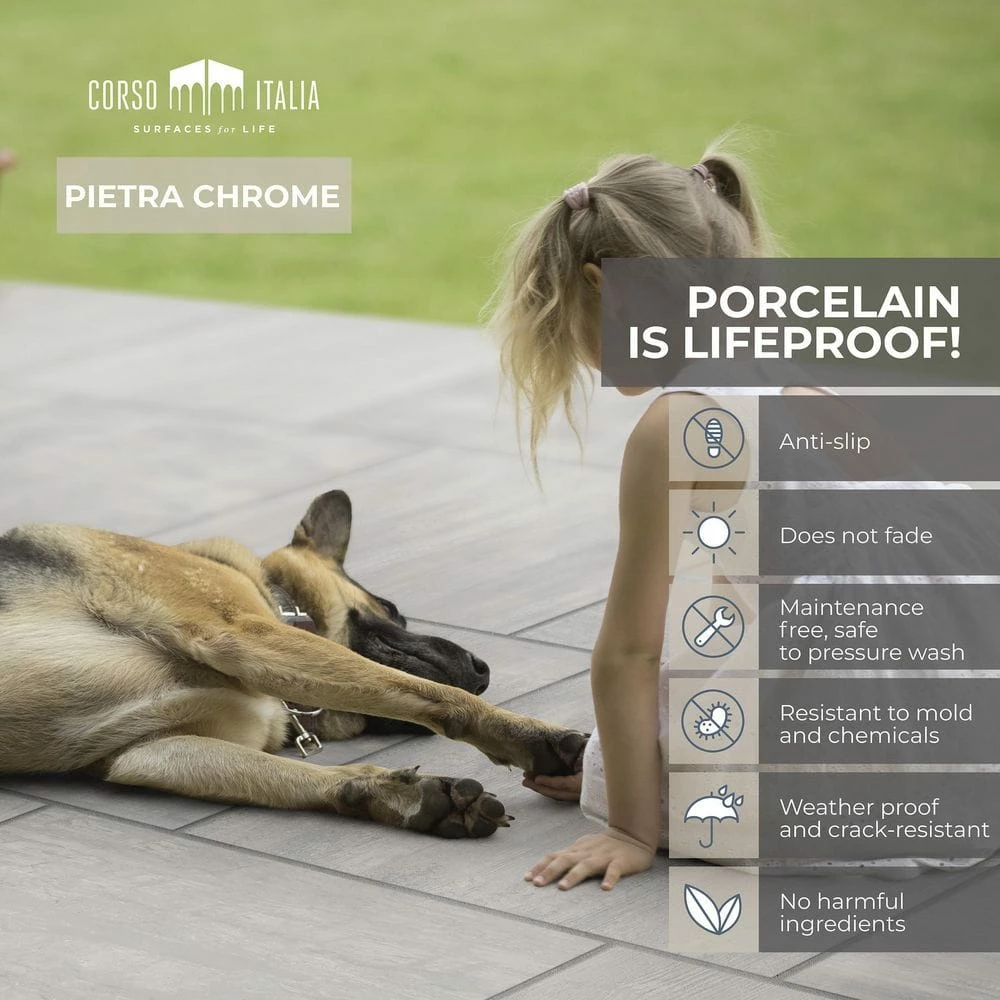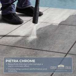 Pietra Chrome combines the beauty and strength of warm concrete with the strength, functionality and performance of porcelain. Featuring a high mechanical resistance, this 24 in. x 48 in. x 0.75 in. paver is twice as thick as conventional porcelain. Pietra Chrome is fit for public and private outdoor venues, and is suitable for dry installation on grass, sand and gravel.
