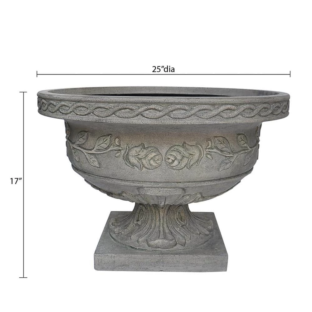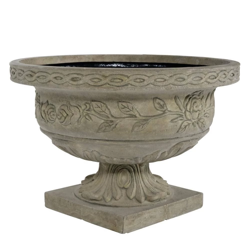 This exclusive low urn, with a square base, is intricately detailed with a rose vine body and chain rim. It is the perfect accent for the entry to your home or garden. Constructed of a blend of natural stone, resin and fiberglass, the urn is lightweight and weather resistant. The 85% crushed natural outer stone surface ages to a beautiful time worn hue as it weathers.