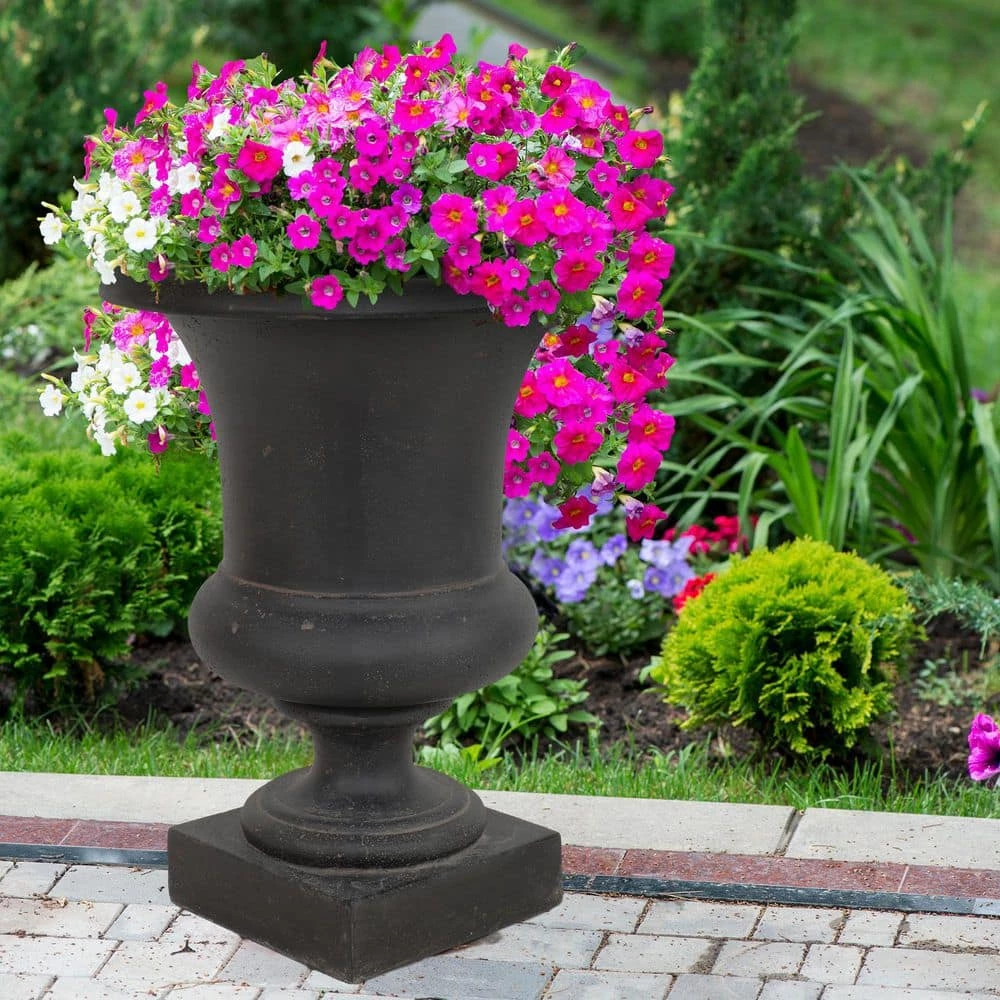 This exclusive, Tuscan inspired Medici Urn has a clean silhouette on a square base. It is perfect for patio, poolside and look great flanking a front door. Constructed of a blend of natural stone, resin and fiberglass, the planter is lightweight, watertight and weather resistant. The 85% crushed natural outer stone surface ages to a beautiful time worn, old world hue as it weathers.