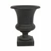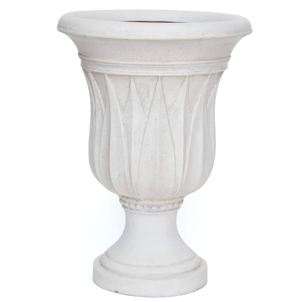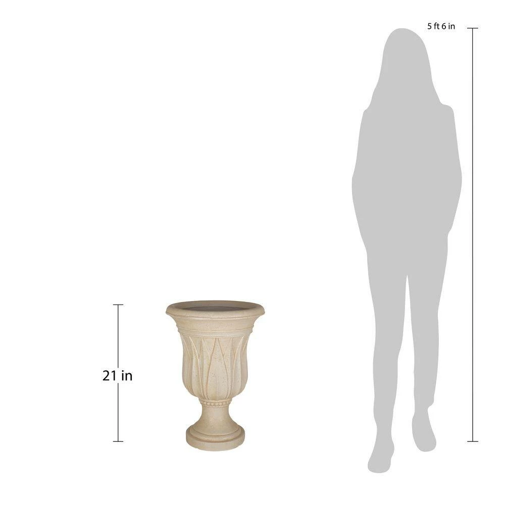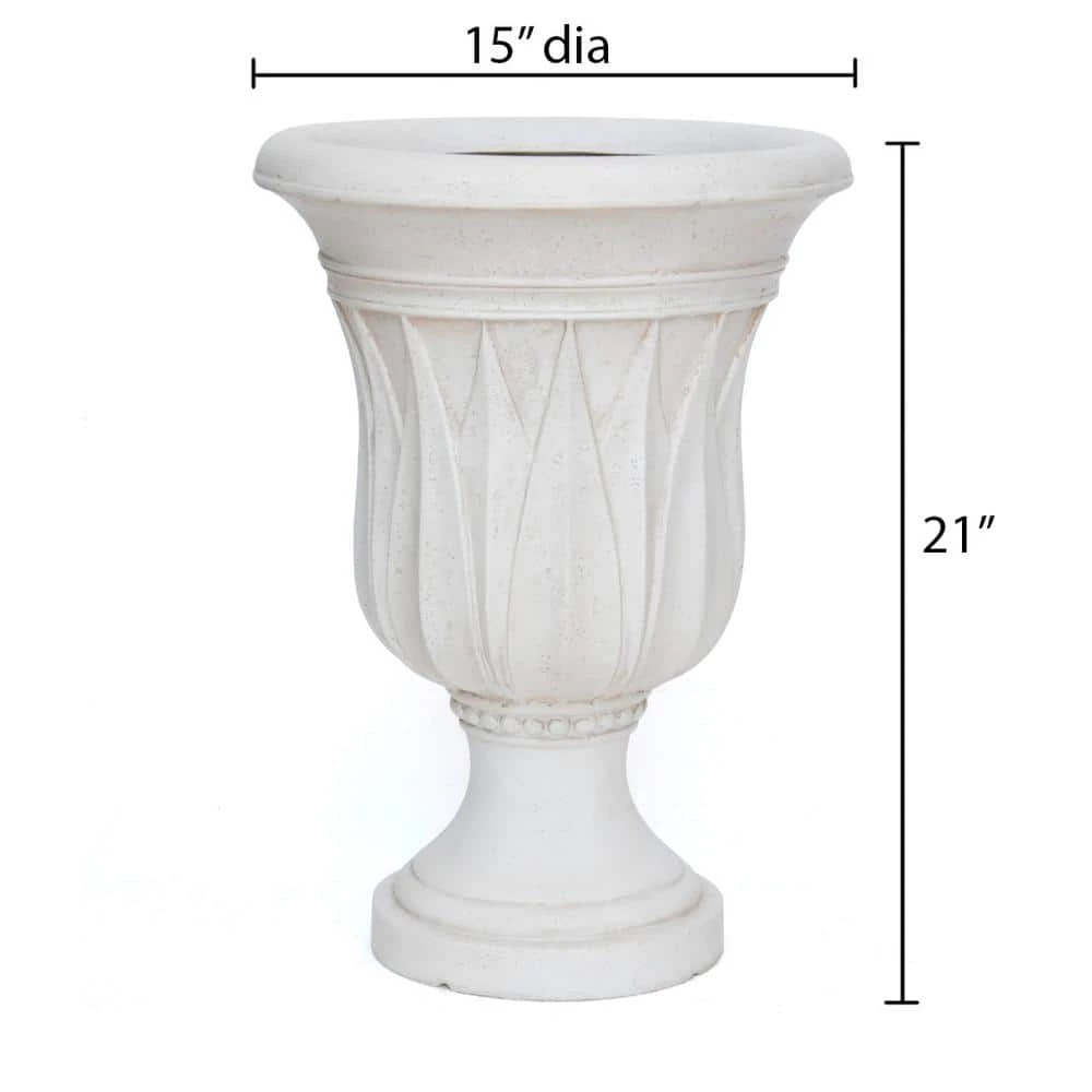 This stately urn with sharp leaf design is perfect for patio, poolside and even indoors. Constructed of a blend of natural stone, resin and fiberglass, the planter is lightweight, watertight and weather resistant. The 85% crushed natural outer stone surface ages to a beautiful time worn, old world hue as it weathers.