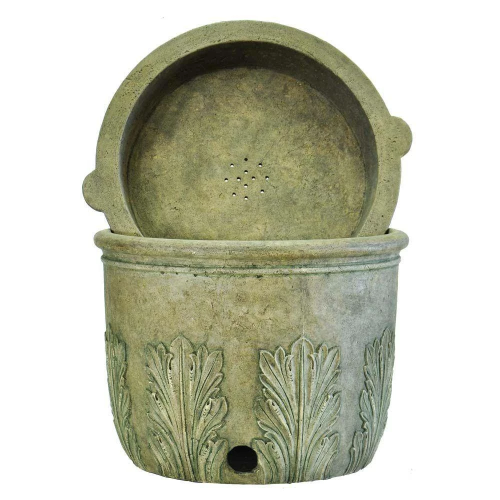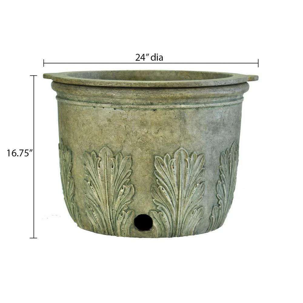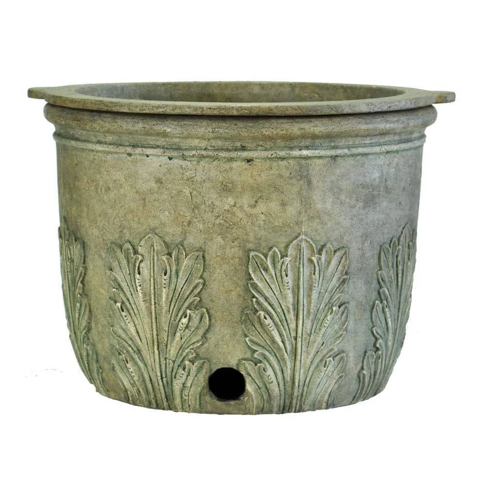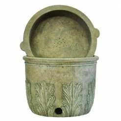 This exclusive, unique hose storage container with etched leaf detail, has a lid that doubles as a planter for small flowers. It keeps your garden hose out of sight but looks like a delightful planter. Constructed of a blend of natural stone, resin and fiberglass, the hose pot is lightweight and weather resistant. The 85% crushed natural outer stone surface ages to a beautiful time worn, old world hue as it weathers.