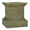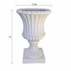 This exclusive fluted urn on a square base is reminiscent of a formal English Garden. Use as a pair flanking the entryway to your home or your garden. Constructed of a blend of natural stone, resin and fiberglass, the planter is lightweight, watertight and weather resistant. The 85% crushed natural outer stone surface ages to a beautiful time worn, old world hue as it weathers. Use the urn by itself or on our coordinating pedestal with intricately detailed cutouts.