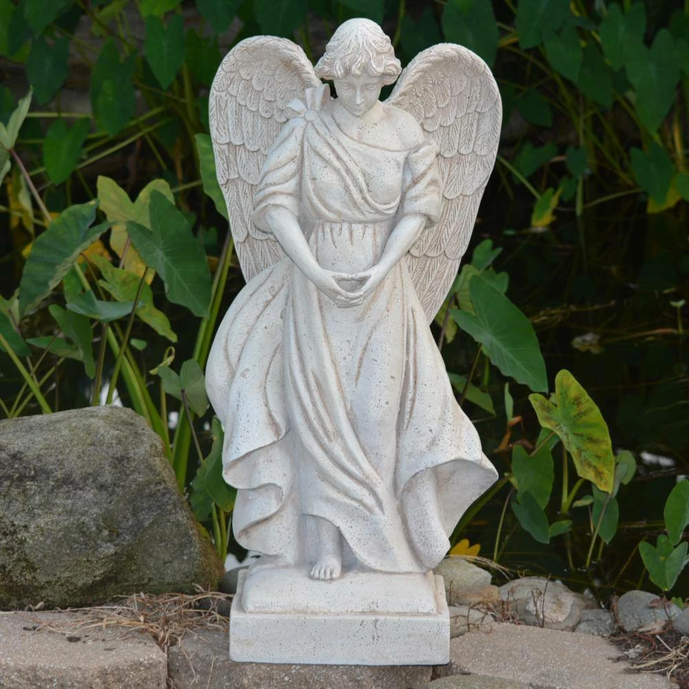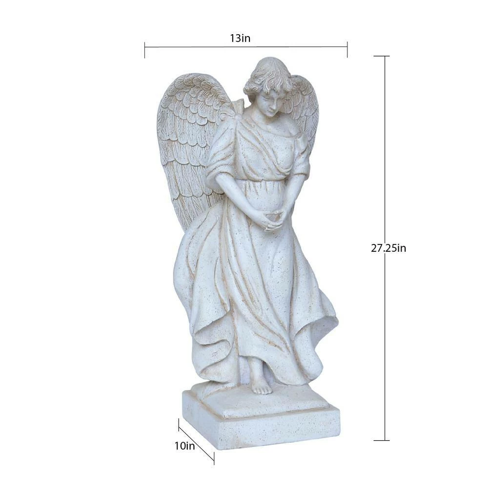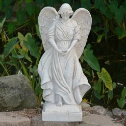 This exclusive garden angel with outstretched wings on a square base is perfect to use as a focal point on your patio or in your garden. It is hand made in a mold from an artist carved original and the detailing of the the wings and the folds of her dress are exquisite. Constructed of a blend of natural stone, resin and fiberglass, the statue is lightweight, watertight and weather resistant. The 85% crushed natural outer stone surface ages to a beautiful time worn, old world hue.