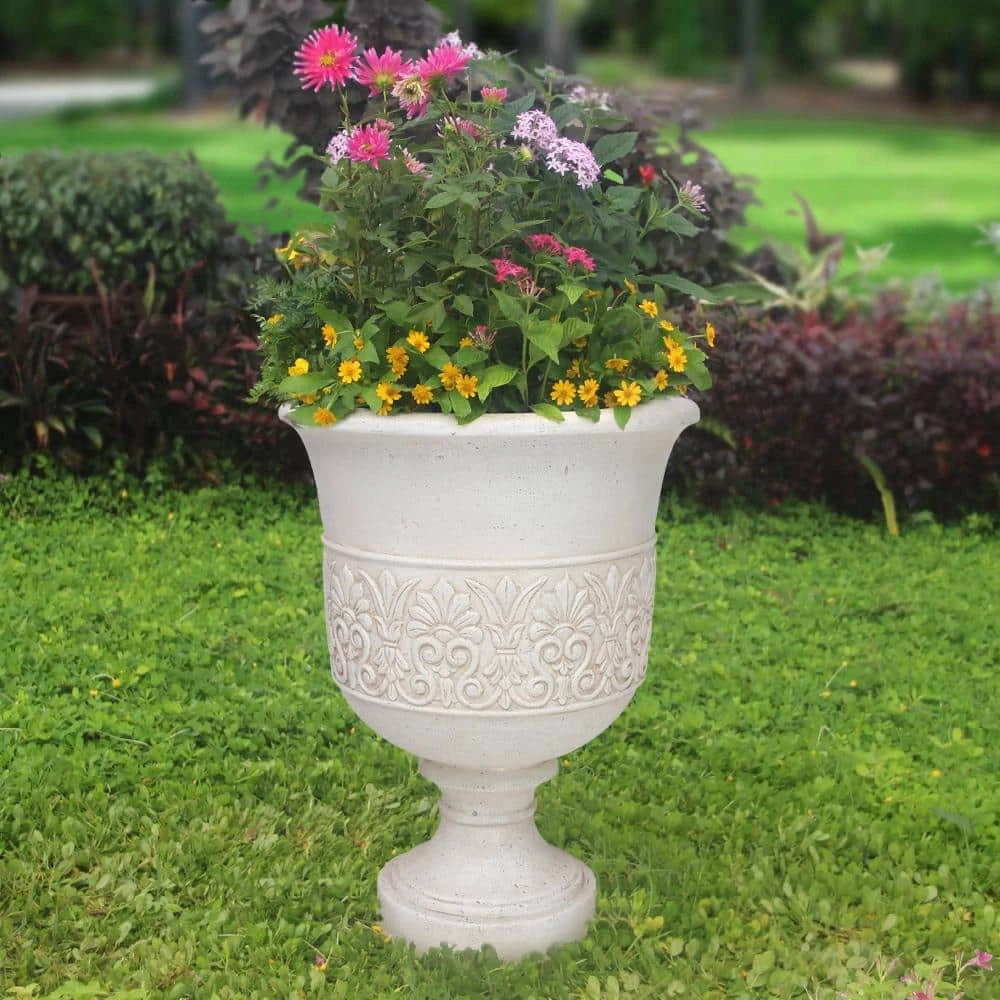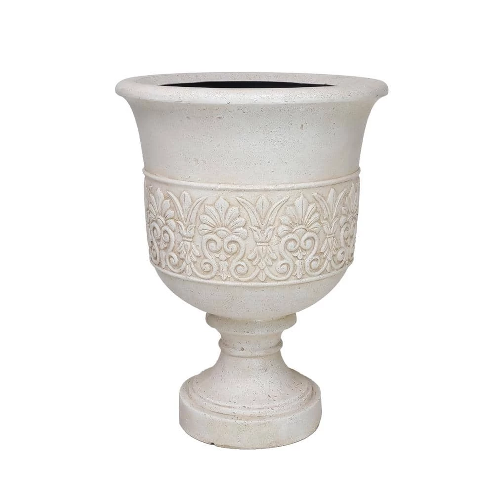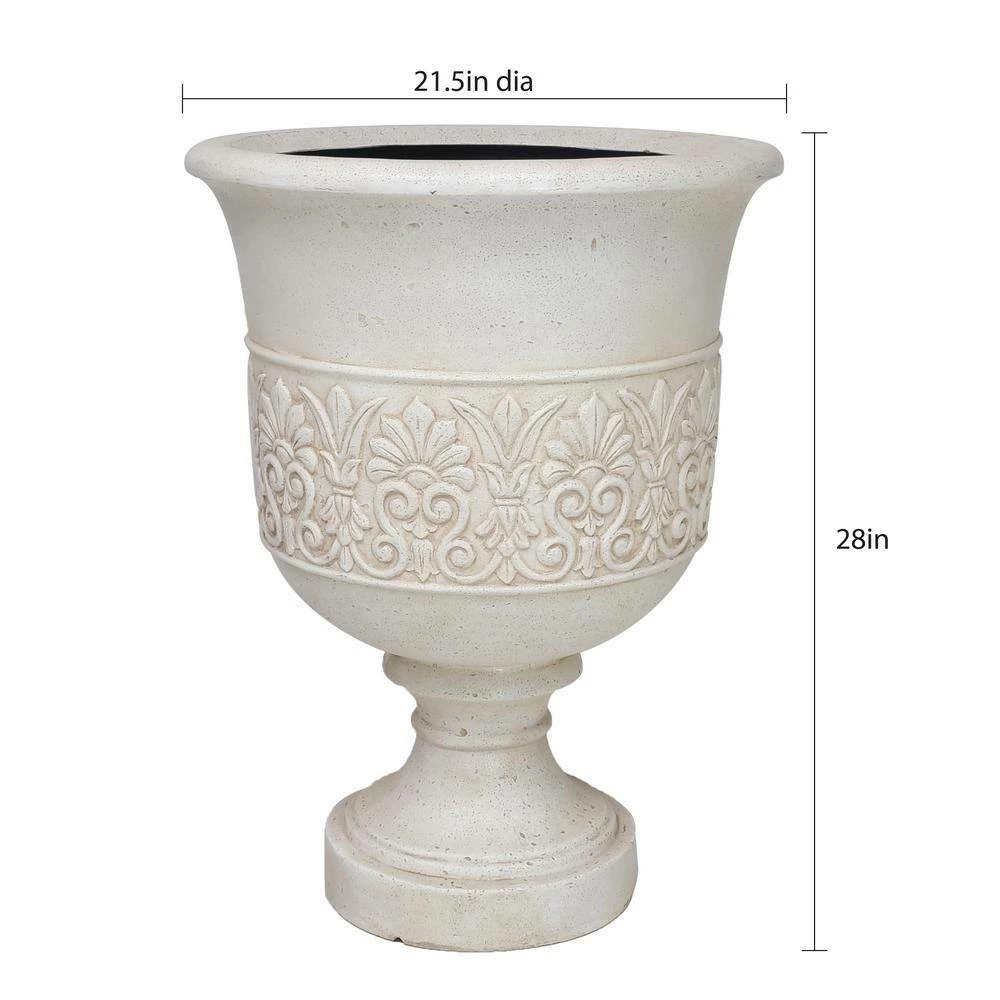 This urn with an intricately embossed band is large enough to hold a small tree. Use as a pair flanking the entryway to your home or your garden. Constructed of a blend of natural stone, resin and fiberglass, the planter is lightweight, watertight and weather resistant. The 85% crushed natural outer stone surface ages to a beautiful time worn, old world hue as it weathers.