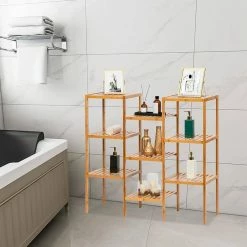 - Multi style storeroom: 9 floors in total, 6 holes in each leg, 8 legs in total, you can assemble them into a 9-story linked bookshelf, or remove the middle shelf to get a 2-story, 3-story vertical shelf, it can be placed in a variety of places, can store a variety of items, such as bathroom, living room, balcony, kitchen, including toiletries, towels, sundries, decorations, accessories, shoes, books, plants, spices and household appliances