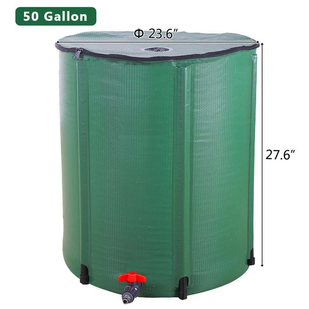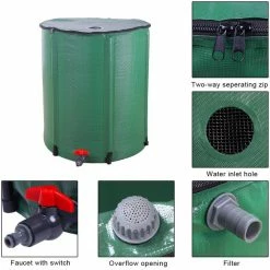 Rain water is ideal for a multitude of applications including biodynamic and organic vegetable gardens, planter beds for botanicals, indoor tropical plants like ferns and orchids and for cleaning household windows. Our 50 Gal. Folding Rain Barrel will be an indispensable tool for you to collect rain water. Simply place the rain barrel beneath a down spout to capture natural rain water. This rain barrel features a foldable barrel design which makes it easy to store and carry. Besides, its green surface naturally fits in with your backyard sight. Zippered mesh cover allows water to collect while blocking leaves and debris, it is also easy to remove for cleaning and maintenance. Connect a hose to the tap on the bottom or scoop from the top with a watering can. Don’t hesitate, come and buy one.