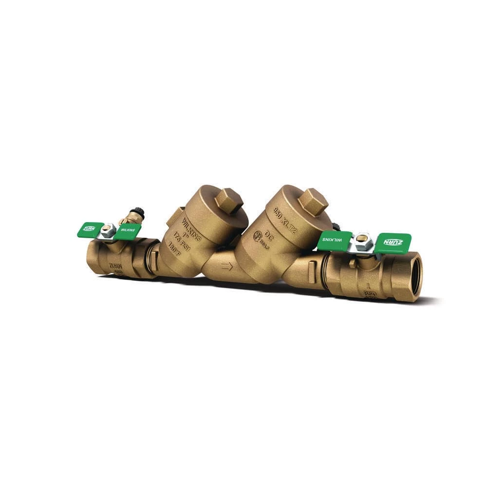 The 1″ 950XLT2 Double Check Valve Assembly includes top access check covers for easy maintenance access, is utilized in low health hazard potable water applications, and is suitable for below grade installation in standard valve boxes. The 950XLT2 protects against both backsiphonage and backpressure while the test cock plug protects against fouling caused by insects, dirt, and debris. It includes corrosion-resistant stainless steel springs, fasteners, and ball valve handles. Features of the 950XLT2 include a maximum working water pressure of 175 psi, hydrostatic test pressure of 350 psi, and a maximum working water pressure of 180 degree F.